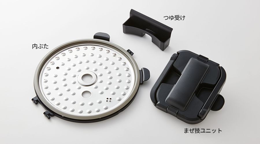 まぜ技ユニット、内ぶた、つゆ受け、蒸気口はカンタンに脱着することができ、食洗機も使えます。(内鍋は食洗機で洗わないでください。)