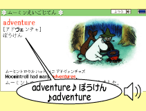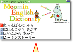 | 8つのムーミンのお話に沿って、英会話を学習。キャラクターの会話の順に、音声が再生され、英文がカラー表示されます。 | |