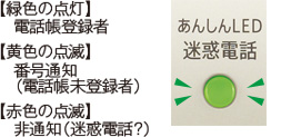 かかってきた電話を電話帳登録者/番号通知/非通知に区分して、緑・黄・赤の3色で表示します。