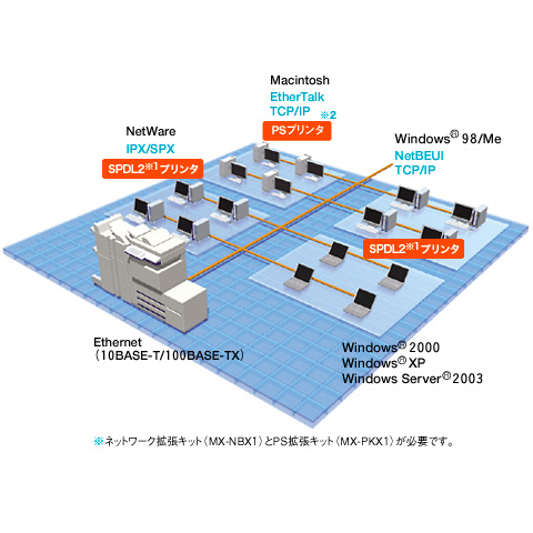 ● ネットワークプリンター機能には、オプションのネットワーク拡張キット(MX-NBX1)が必要です。