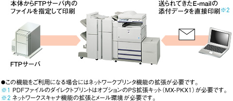 TIFFやPDF※1ファイルをプリンタードライバーを介さずに直接本体に送信して印刷できます。また、本体パネルからFTPサーバー内のファイルを指定して印刷、さらに送られてきたE-mailの添付データを直接印刷することができます。