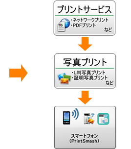 写真をプリントする場合:「プリントサービス」⇒「写真プリント」⇒「スマートフォン」の順に選択します。