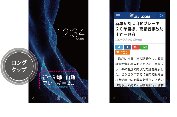 エモパーが表示しているニュースや近くの駅などの情報を、ロック解除せずに専用ウィンドウでチェックできるようになりました。ロック画面上のエモパー表示エリアをロングタップ(長押し)している間、専用ウィンドウが表示されます。