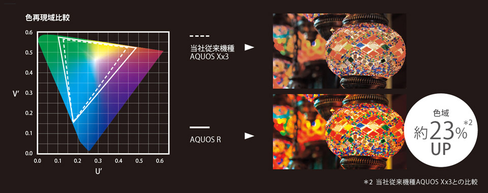 液晶テレビAQUOSの技術を受け継いだ「リッチカラーテクノロジーモバイル」を搭載。デジタルシネマの標準規格(DCI*1)に対応した広色域パネルと、豊かな色域を再現するカラーマッピング技術により、写真や動画を実物に近い色味で表示し、鮮やかに美しく再生できます。