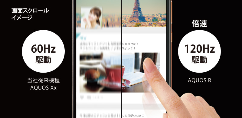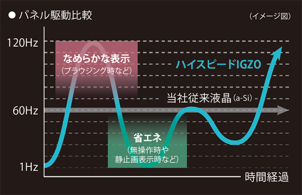 倍速120Hz駆動のハイスピードIGZO液晶ディスプレイは、従来の60Hz駆動に比べ、2倍*1の情報量を表示するため、画面スクロール時や動きの激しい動画でも、残像を抑えたなめらかな描画を実現。また、液晶パネルの応答速度を向上させる優れた設計により、従来の120Hz液晶表示よりも応答速度が速く、残像感の少ない見やすい表示を実現しました。