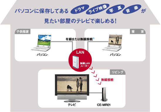 最大54Mbps※1の「高速ワイヤレスLAN(IEEE802.11a/b/g準拠)」に対応。CE-MR01とテレビを映像ケーブルでつなげば、パソコンに保存されている動画や写真などのコンテンツをワイヤレスで受信でき、離れた部屋のテレビで楽しめます。※2※3