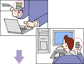 ノートパソコンで作成した報告書のデータをメモリーカードに一旦保存。帰社後、デスクのパソコンで呼び出し、続きの作業を行っていた。