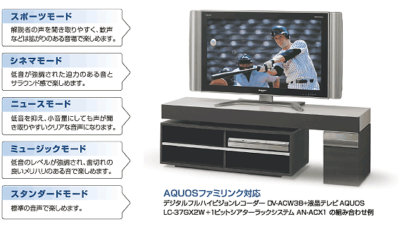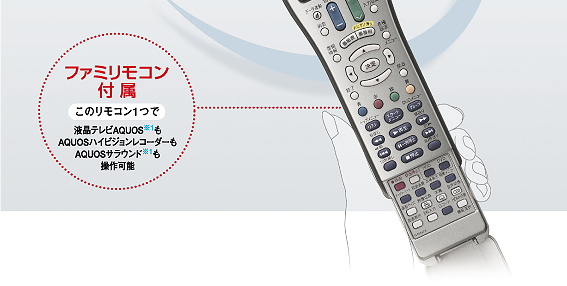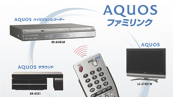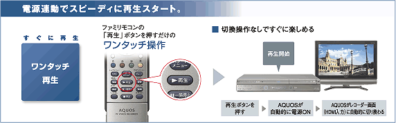 | ハイビジョンレコーダーに加えて、液晶テレビやシアターラックシステムも同じAQUOSで揃えれば、HDMIケーブル接続により1つのリモコンで連携操作が可能です。これまでのように、いくつものリモコンを使い分ける必要もなく、ワンタッチで、それぞれの機器が自動的に立ち上がり、スピーディに録画や再生を開始します。画質や音質はもちろん、使いやすさまで革新した、AQUOSならではの先進機能です。 | |