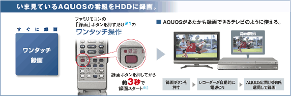 | ※1 リモコンのスイッチを「AQUOS」側にして操作します。※2 一発起動の設定(クイック起動設定)を「する」にしておく必要があります。録画するチャンネル等の条件により少し時間がかかる場合があります。 | |