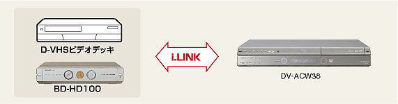 | 本機のハードディスクと他のi.LINK機器(D-VHSビデオデッキなど)との相互ダビングやムーブが可能※1。例えば、ハイビジョンで録画したお気に入りの映像をそのままの画質でD-VHSにライブラリーとして保存できます。 | |