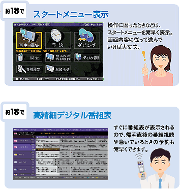 | ※1 2006年5月現在、ハイビジョン録画対応ハードディスク一体型DVDレコーダーとして。 ※2 接続するモニターや端子によっては少し時間がかかる場合があります。●番組表は架空のものです。 | ||