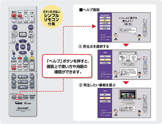 | 使用頻度の高いボタンを使いやすい位置に配置。さらにボタンの色や形、手に取ったときのバランスまで配慮し、より使いやすいリモコンになりました。 | |