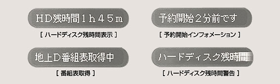| 番組タイトルを表示する「タイトルウインドゥ」では、ハードディスクの残量や予約開始についてのインフォメーションなど、お知らせ表示も可能です。 | |