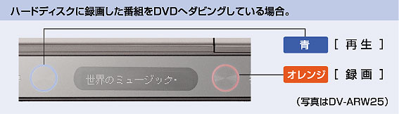 | ハードディスク、DVD、VHSの動作状態が一目でわかる「メディアサークル」を搭載。白・オレンジ・青の光でスタンバイ・録画・再生のそれぞれをチェックできます。 | |
