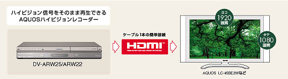 | 次世代デジタルインターフェイス「HDMI出力端子」を搭載。HDMI入力端子を備えた液晶テレビAQUOSなどと本機を市販のHDMIケーブルで接続すれば、フルデジタル接続による劣化のないハイビジョンの高画質と高音質が楽しめます。また、市販のDVDビデオも、ハイビジョン と同じ1080iにアップコンバートして再生されるので、より高画質に楽しめます。 | |