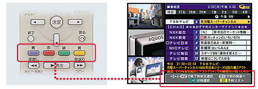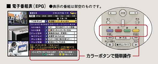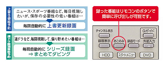 画面上に表示されるテレビ番組表で最大8日分の放送予定番組を確認可能。その中から録画したい番組を選ぶことで簡単に録画予約ができます。番組の検索は、映画・音楽など、好きなジャンルを指定する「ジャンル検索」、俳優やミュージシャンの名前など、お目当てのキーワードを指定する「キーワード検索」が可能です。また、録画した番組には自動的に番組タイトル名が記録されますので、検索や保存に大変便利です。