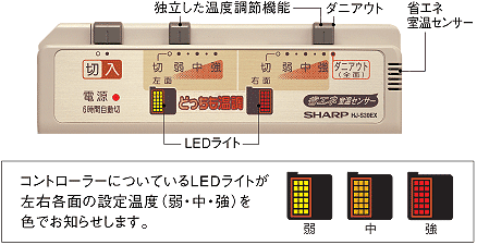 使う人の好みや体感温度にあわせ、左右それぞれのスイッチで温度調節ができます。また、ムダな暖めすぎを抑えるので省エネ効果が高まります。
