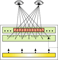 視差バリアにより光が分離され、左右の眼には異なる光が届くため、立体的に見える。