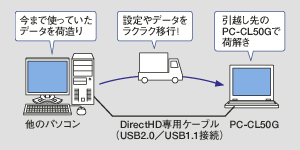 お手持ちのパソコンからPC-CL50Gへ、メールの設定やインターネットのお気に入り、データなどが、高速・手軽に移行
