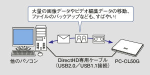 CD/DVDディスクやメモリーカードを使わなくても、DirectHD専用ケーブル1本で、お手持ちのパソコンからPC-CL50Gへ、大容量データを最大480Mbps