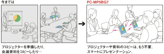 ●ワイヤレスで他のパソコンとデータ共有、『無線deおしゃべり』。※5※6 インターネットが利用できない場所でも、パソコン同士をワイヤレスで直接接続。会議資料の画面をその場で配信したり、表示画面を出席者のパソコンに映せるので、ミーティングもスムーズに進みます。