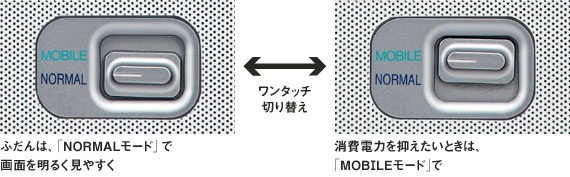 | 省電力設計により、約5.0時間※2の長時間駆動を実現。また、MOBILEスイッチをMOBILEモードに切り替えれば、CPU処理能力と画面輝度を抑えた※3、消費電力重視の設定になります。 |