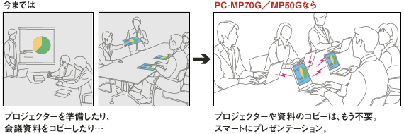 ●ワイヤレスで他のパソコンとデータ共有、『無線deおしゃべり』。※5 インターネットが利用できない場所でも、パソコン同士をワイヤレスで直接接続。会議資料の画面をその場で配信したり、表示画面を出席者のパソコンに映せるので、ミーティングもスムーズに進みます。