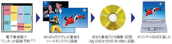 | WinDVR※2の電子番組表で、見たい番組を録画予約。録画した番組は、MyDVD4で編集。大切にしたいテレビ番組をDVDで保存して楽しむことができます。 |