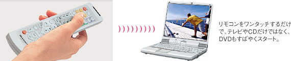 電源オフ状態から、リモコンか本体のボタンをワンタッチするだけで、Windows(R)を起動せずにテレビやDVD、CDをすばやくスタート※1。音量の設定やチャンネルの変更、DVDやCDの操作がリモコンでできるので、AV機器感覚で楽しめます。 |