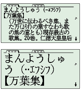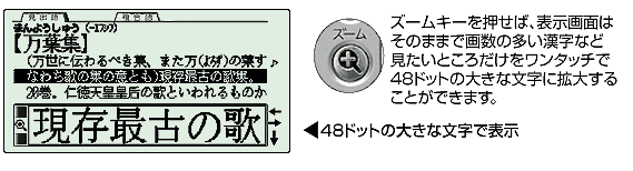 | 一覧性が高く明るく見やすい【大画面】液晶を採用しています。広辞苑の見出し語は常に【大きな文字】で表示しす。さらに「文字サイズキ ー」を押せば、画面に表示されているすべての文字をワンタッチで拡大(縮小)でき、好みの文字サイズに切り替えることができます。また、「ズームキー」を押せば、画数の多い漢字など見たい部分だけを拡大することができる「スーパーズーム機能」でさらに読みやすく表示します。 【以下の4つの文字サイズに切り替え可能です】 ◎ 48ドット表示:漢字・カナ6文字×3行 ◎ 24ドット表示:漢字・カナ13文字×6行 ◎ 16ドット表示:漢字・カナ20文字×8行、英字40文字×8行 ◎ 12ドット表示:漢字・カナ26文字×11行、英字53文字×11行 |