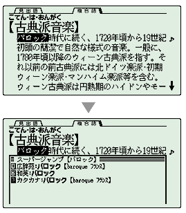 画面上で、調べたいと思った「言葉」の意味や読みなどをコンテンツからコンテンツへ、次々ジャンプして調べることができます。