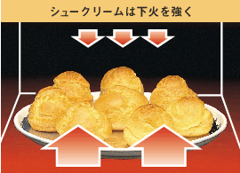 | ズーム式ヒーター メニューに合わせて、ヒーターが自動的に下降。食品に近づいて、強火で一気に焼き上げます。メニューによって、レンジ加熱とヒーター加熱を組み合わせ、スピーディーに調理します。 |