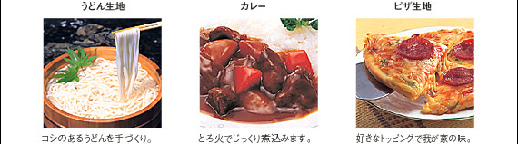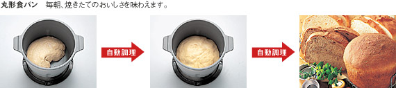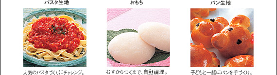 丸形食パン(1.5斤)は、こねから焼き上げまで自動調理。カレーやシチューは、材料を入れれば、かきまぜながら、じっくりと煮込みます。焦げつきや吹きこぼれの心配もありません。さらに、ピザ生地、うどん生地、おもちなども手軽につくれます。