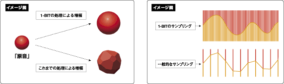 | 余計なものをいっさい必要としない“シンプル・イズ・ベスト”の考えをオーディオ機器のフィールドに取り入れて生まれたのが、1ビットテクノロジー。1ビットデジタルアンプの基幹デバイスである「高精度1チップ△Σ変調LSI」が、微細な入力信号を1ビットのデジタル信号に変換することを実現しました。この変換方式は、直前の信号に対する変化量に基づいてデジタル化を行う、きわめてシンプルといえるもの。従来のマルチビット信号での処理に見られる情報の間引き・推量補間を伴わず、デジタル信号で音を増幅することにより、ノイズの混入や歪みの影響を受けにくい原音に忠実な増幅を実現するため、本来のアナログソースの音質をそのまま維持することができるのです。 | |