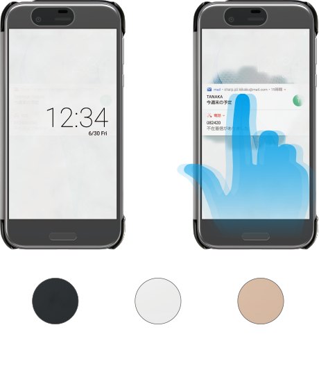 AQUOS Rにぴったりフィットするスタイリッシュな純正カバー(別売)をご用意。半透明のフルスクリーンカバーは、指で触ったところだけクリアになり、通知を確認したり消去することもでき、また音楽プレイヤーの操作も可能です。音声着信時やアラーム鳴動時は自動的に透明になり、カバーを閉じたままで通常の操作ができます。詳しくはこちら