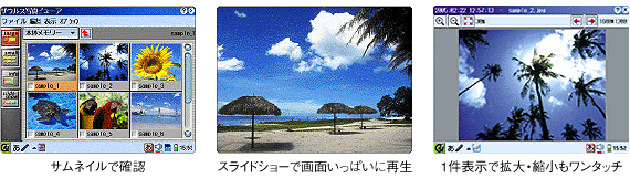 ハードディスク搭載だから、フォトストレージとしても活用可能。たっぷりの写真を保存し、ザウルスの高精細画面でみんなで見ることができます。写真は大/小のサムネイル表示やスライドショーによる自動再生、拡大・縮小できる1件表示も可能。さらに、Exif情報の閲覧や編集もできます。