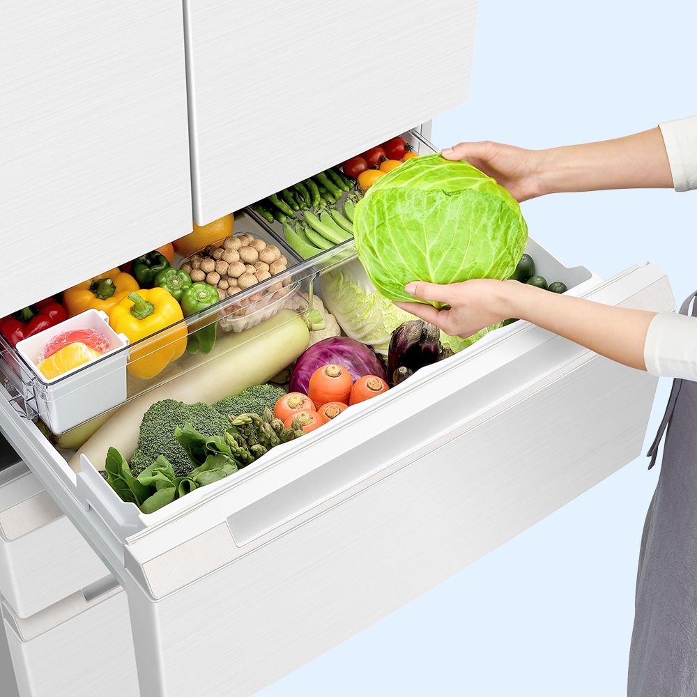 野菜を10日間シャキット保存※1。野菜室が真ん中だから立ったままで大物野菜も出し入れラクラク。
