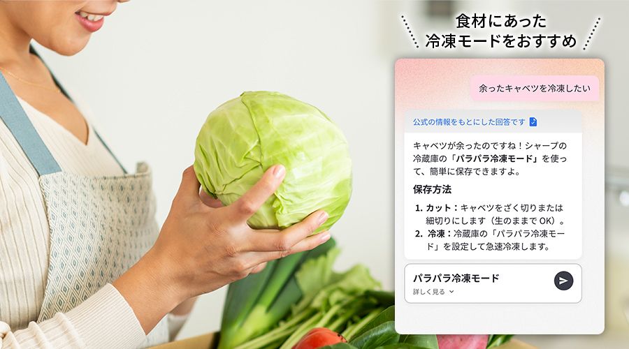 冷蔵庫の使い方で気になることは「COCORO HOME AI」に質問。取扱説明書やシャープならではの知識をもとに、AIがわかりやすく回答します。さらに、お手入れのコツや、食材や目的に合った冷凍モードのおすすめ・設定までサポートします。
