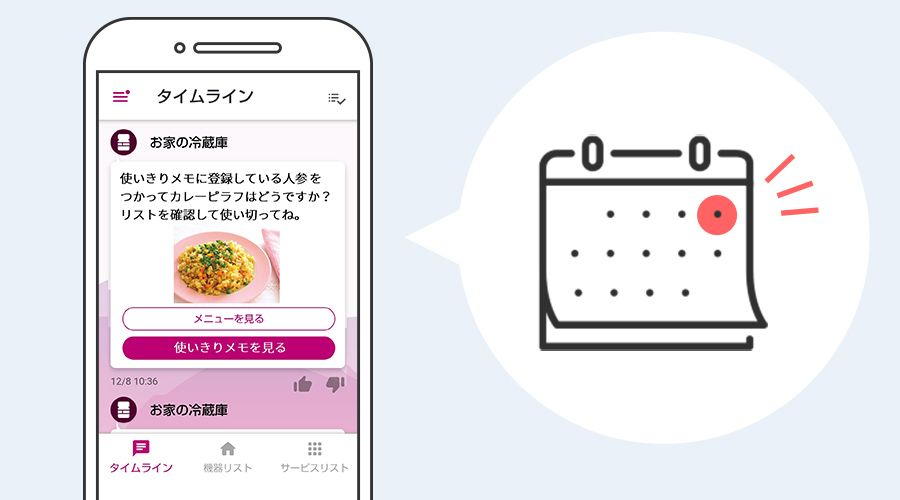 使いきりメモに残った食材を登録しておけば、お知らせ日に使い忘れてないかリマインドします。