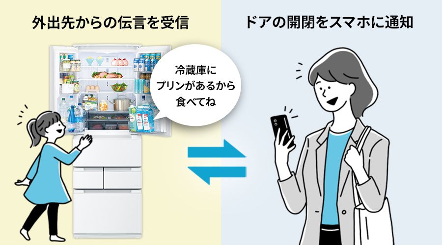 外出先から「COCORO HOME」アプリを通じて冷蔵庫に伝言を送信できます。ドアの開閉情報も確認できて便利です。