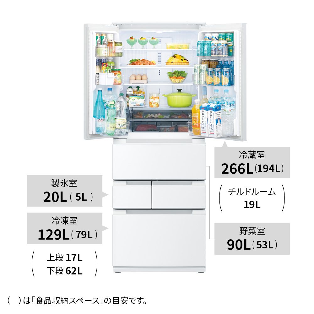- ※2定格内容積は、日本産業規格(JIS C 9801-3:2015)に基づき、庫内の温度制御に必要でない庫内部品(棚やケース等)を外した状態で算出したものです。