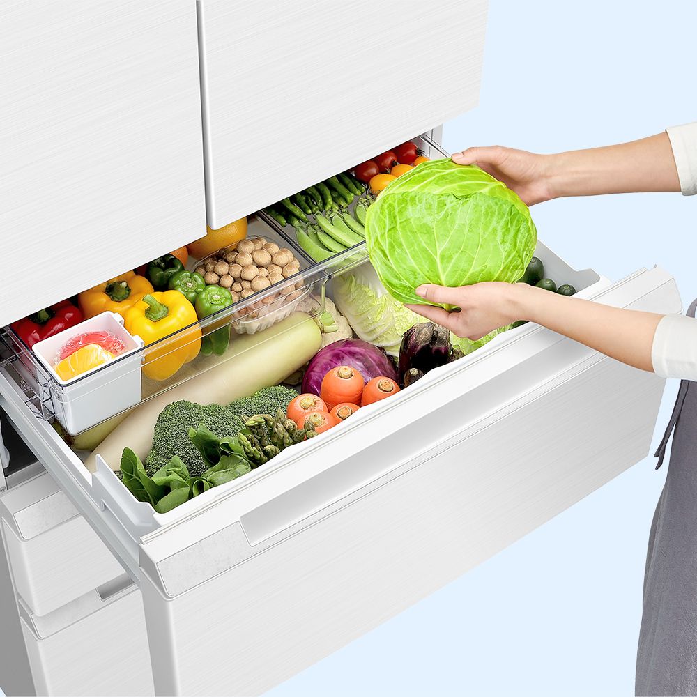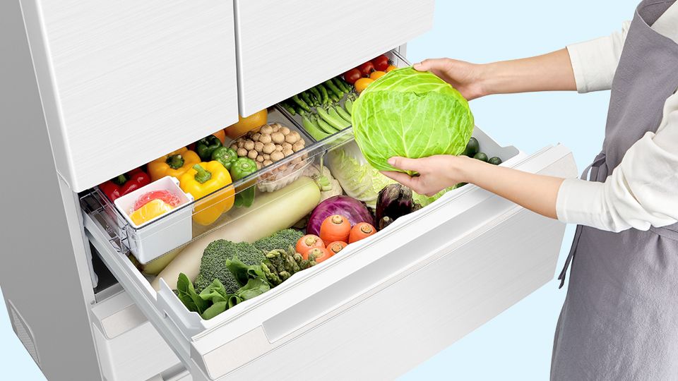 野菜を10日間シャキット保存※1。野菜室が真ん中だから立ったままで大物野菜も出し入れラクラク。