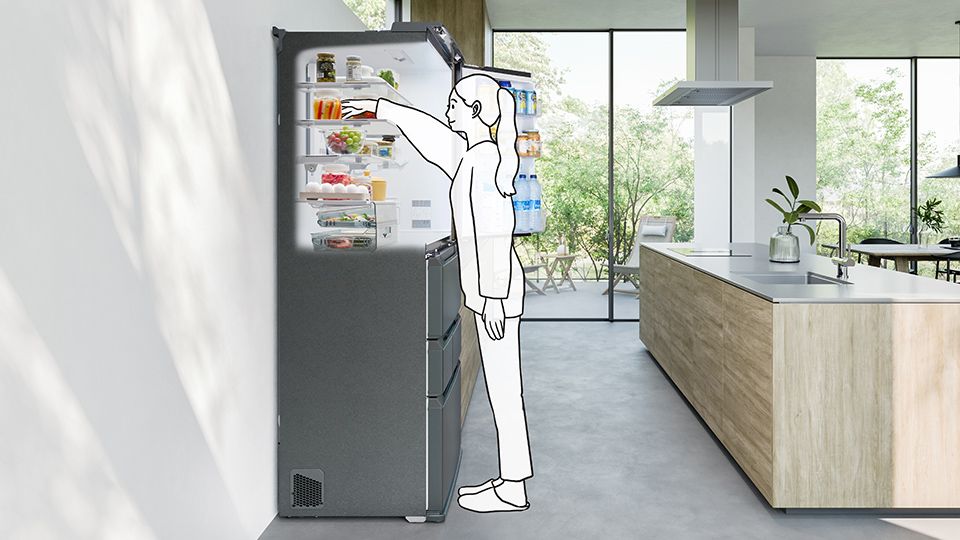 野菜を10日間シャキット保存※1。野菜室が真ん中だから立ったままで大物野菜も出し入れラクラク。