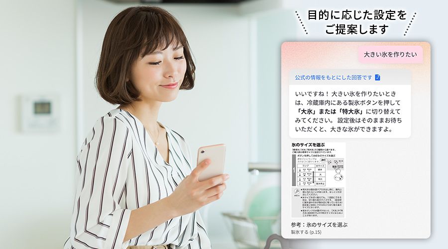 冷蔵庫の使い方で気になることは「COCORO HOME AI」に質問。取扱説明書やシャープならではの知識をもとに、AIがわかりやすく回答します。さらに、お手入れのコツや、食材や目的に合った冷凍モードのおすすめ・設定までサポートします。