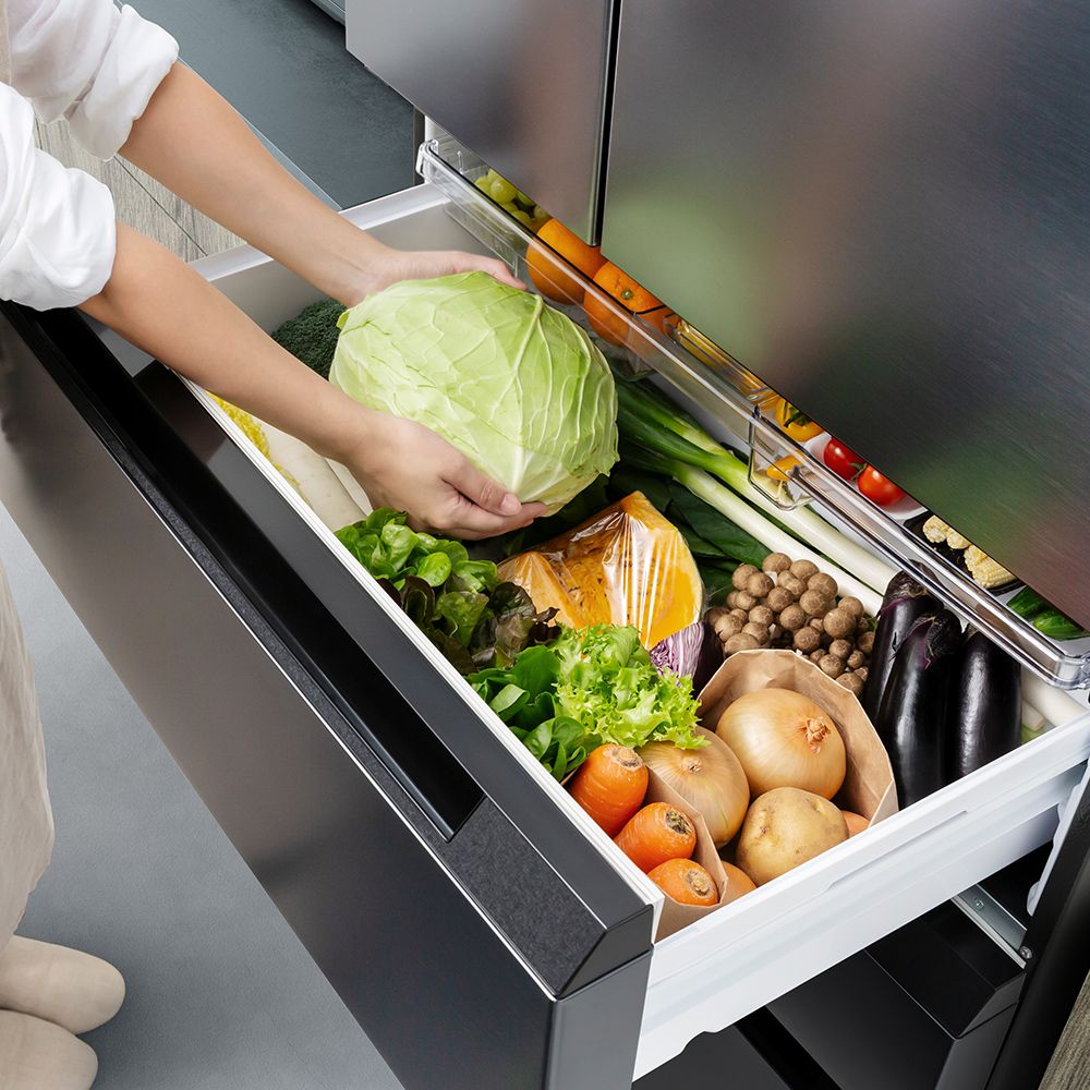 野菜を14日間シャキット保存※1。野菜室が真ん中だから立ったままで大物野菜も出し入れラクラク。