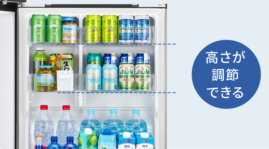 ビンやボトルの高さに合わせて、ドアポケットの高さが調節できます。