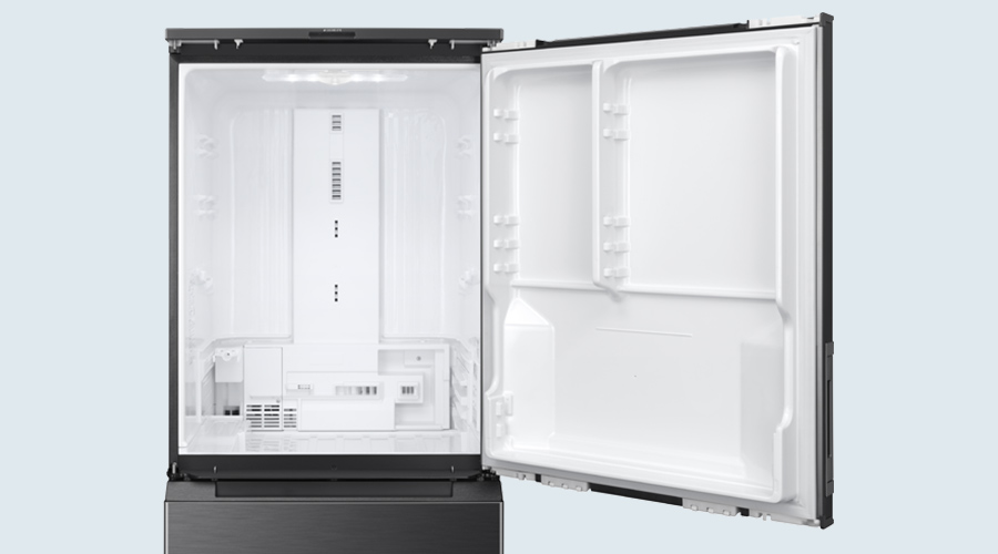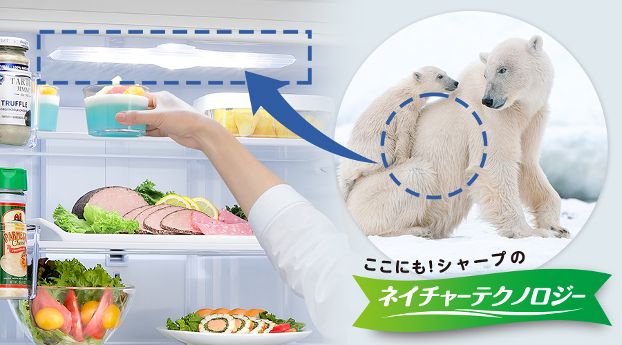 一本一本透明なシロクマの毛は、中が空洞になっていて、光を散乱させるために白く見えます。その構造をLEDランプカバーに応用。LEDライトを広く拡散し、奥まで明るい庫内を実現。