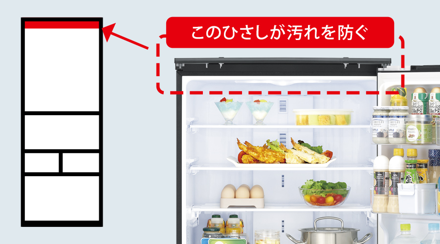 冷蔵室上部のひさしが、キッチンに舞うホコリや油汚れからパッキンを守ります。