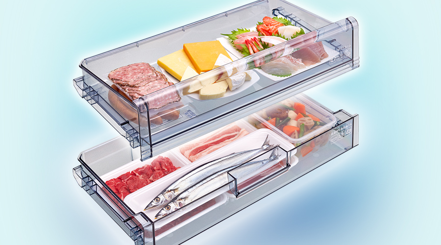 お刺し身やハム・チーズなどの鮮度や乾燥にデリケートな食材は「うるおいチルド」で、肉・魚などの生鮮食品や惣菜は、「低温作りおきルーム」で鮮度をキープ。