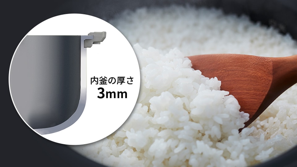 「厚釜」がお米の芯まで熱を伝え、底面を球状にした「球面炊き」でおいしく炊き上げます。
